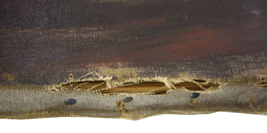 Instead of re-lining (reinforcing an original canvas by sticking a new canvas to the reverse of the painting), we add strips around the damaged tacking edges of the original canvas (Strip lining).