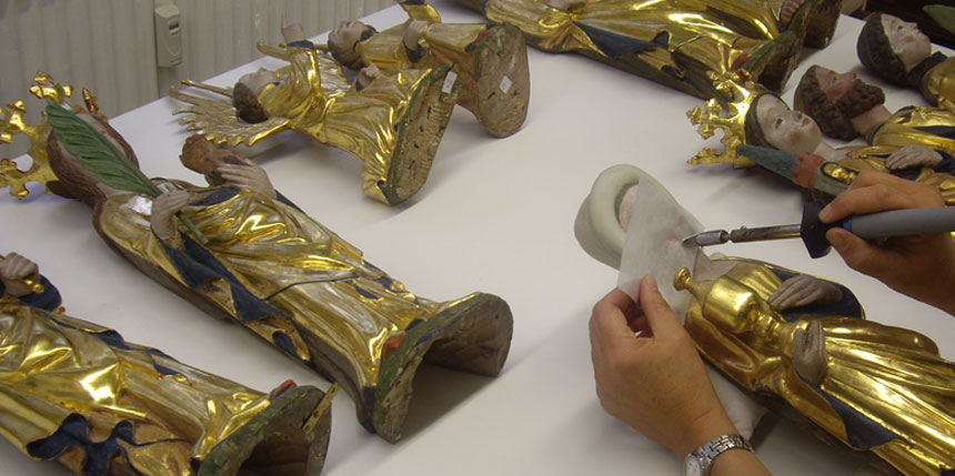 In addition to being painted, polychromed sculptures are also very often gilded. Such complex, multilayered surfaces are extremely delicate and sensitive.